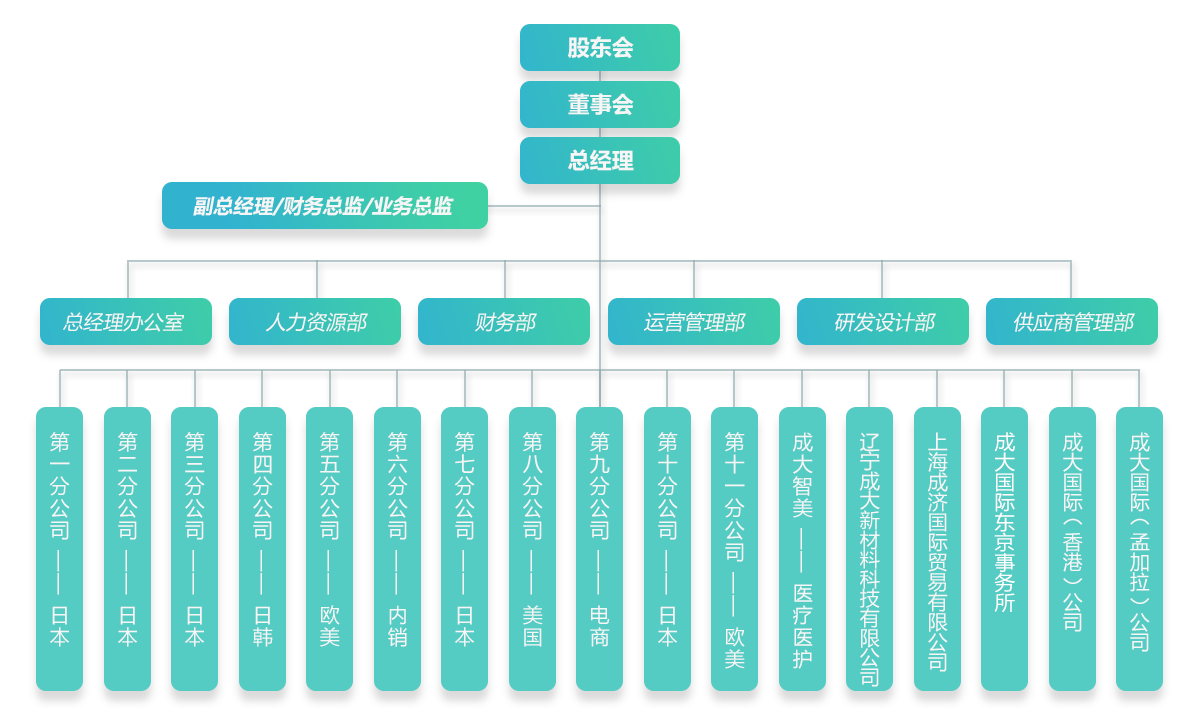 遼寧成大國(guó)際貿(mào)易有限公司是繼承遼寧成大股份有限公司原有主營(yíng)業(yè)務(wù)——紡織服裝進(jìn)出口貿(mào)易,改制成立的控股子公司。30年來(lái),成大國(guó)際已由傳統(tǒng)的紡織服裝貿(mào)易公司發(fā)展成為具備研發(fā)設(shè)計(jì)、前沿營(yíng)銷(xiāo)、跨國(guó)采購(gòu)和物流服務(wù)為一體的增值貿(mào)易服務(wù)商,為客戶(hù)提供一站式整體解決方案。公司總部位于大連,在上海、東京設(shè)有全資子公司。